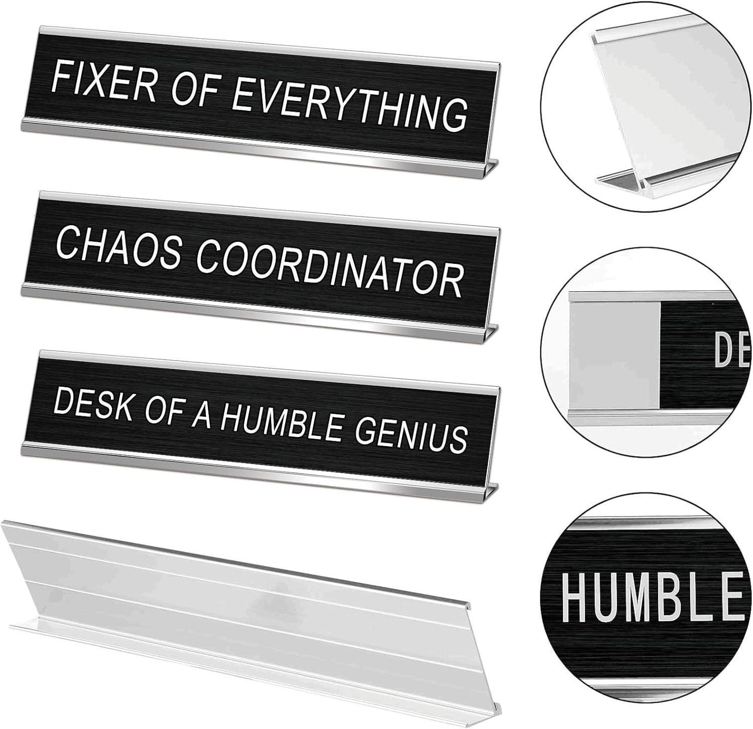 Specially designed to fit into your office space seamlessly, each desk plaque measures approximately 10 x 2 inches, an ideal size that doesn’t dominate your workspace but is still noticeable enough to catch anyone’s attention; As these signs are easy to place and move around, you can create an ideal workspace that truly reflects you