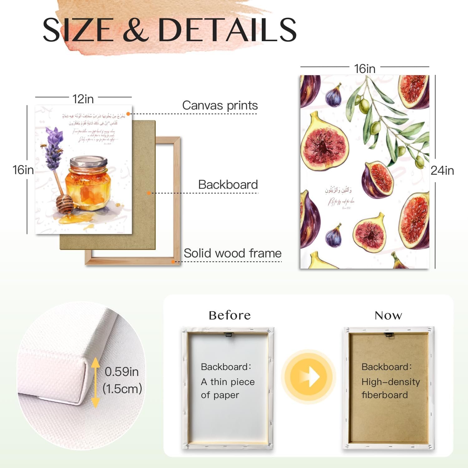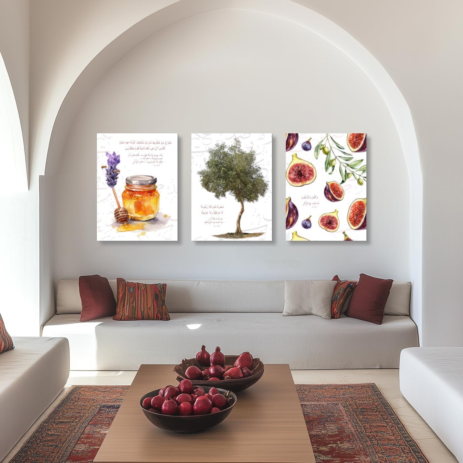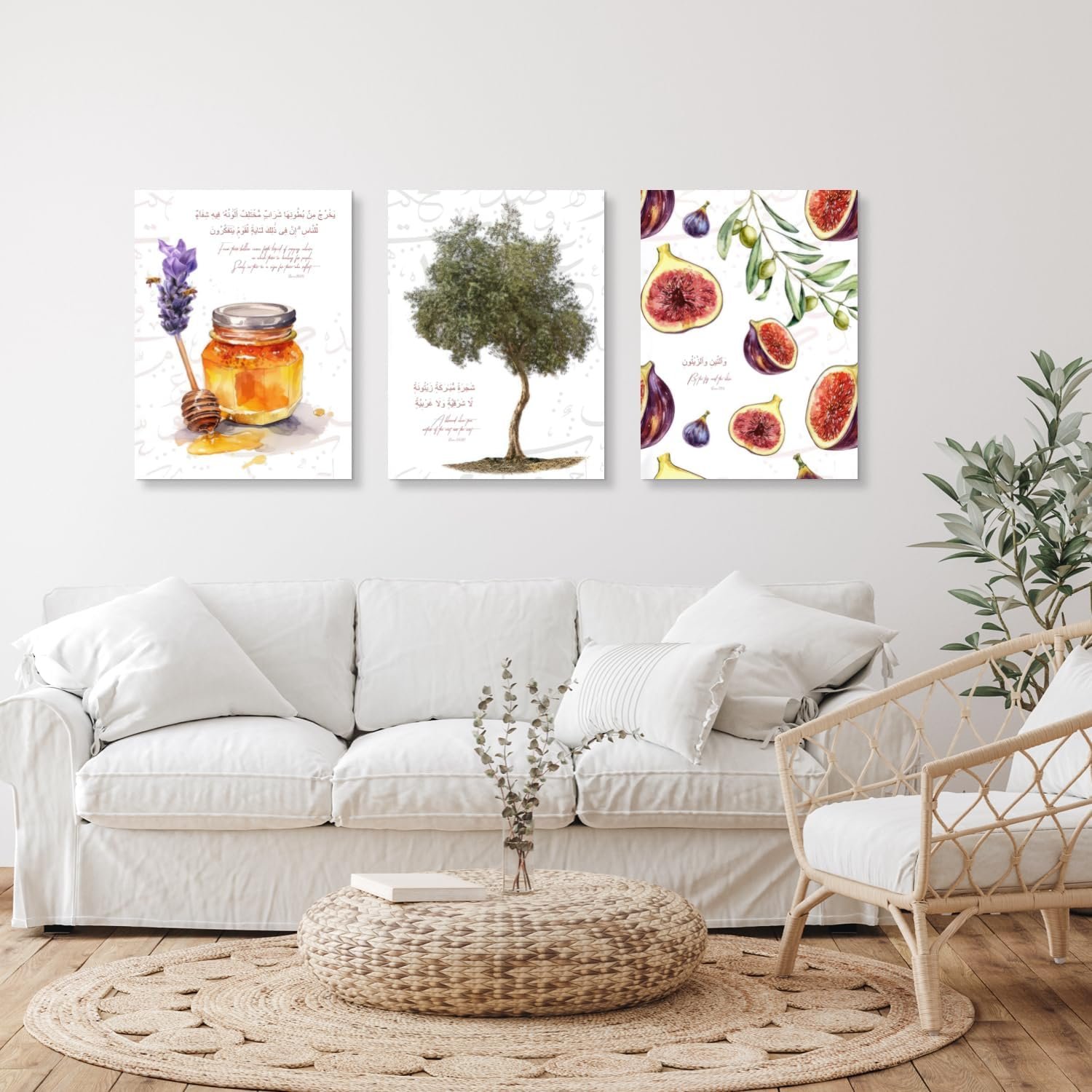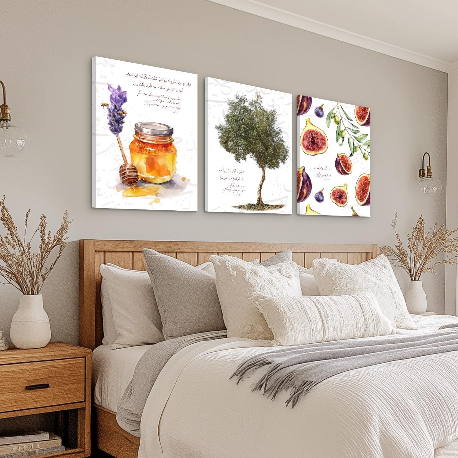 Islamic Quran Design: This Islamic wall art set of 3 12×16 inches pieces features exquisite illustrations of honey jars with lavender, a majestic olive tree, and vibrant figs, paired with meaningful Arabic calligraphy and Quranic verses, including references to Allah and Bismillah. The natural elements combined with spiritual text create a serene and inspiring decor piece, making it a beautiful addition to your home.