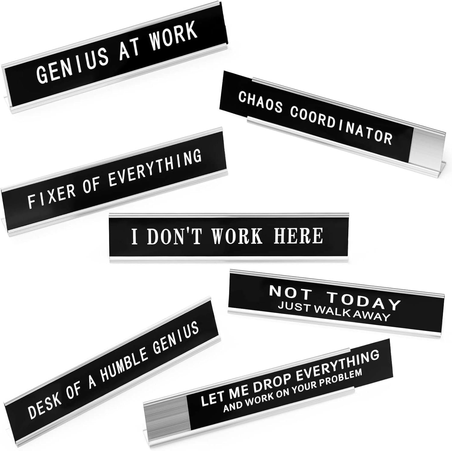 You will receive 8 black desk plaques. Each featuring an enjoyable quote or saying will surely bring a touch of energy and entertainment to your desk in your home, office, or wherever your workspace may be.