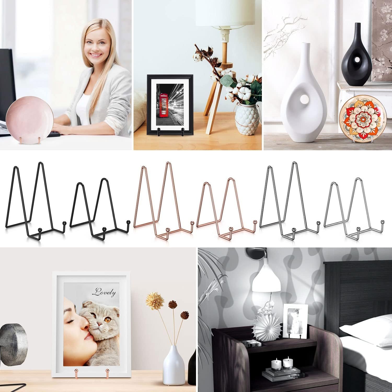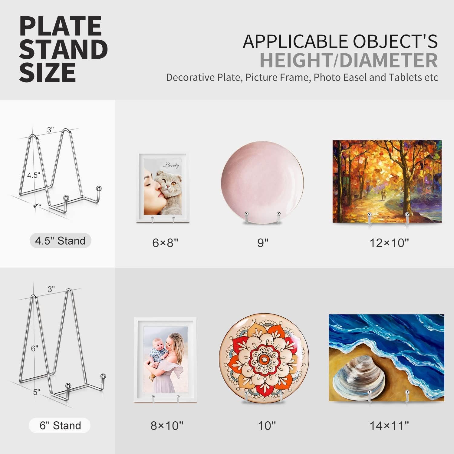 PERFECT PLATE STAND FOR YOUR – 4.5 inch plate stands for display fits for objects of 5 – 11″ Height (Diameter), Lip Depth: 1.2 inch. 6 inch plate holder stand fits for objects of 7 – 15″ Height (Diameter), Lip Depth: 1.25 inch. In addition we provide (Black / Rose Gold / Silver) three different colors of plate holder to enrich your choice, match your different home decor style perfectly.